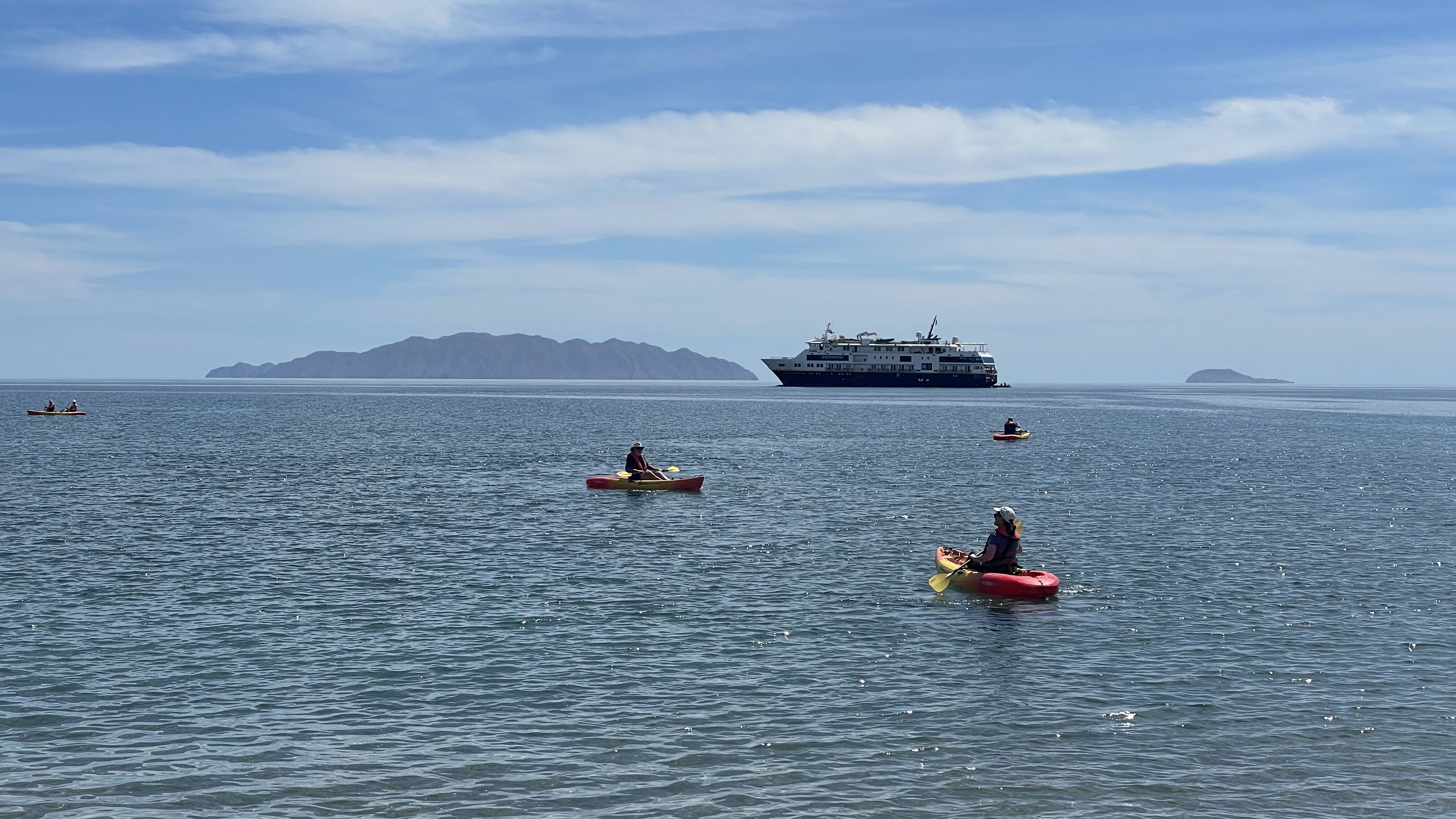 During the afternoon, the ship motored north through a narrow channel where herons, sandpipers, and even some coyotes could be seen on the mudflats. Bottlenose dolphins rode the bow wave on a couple of occasions. As dusk settled in, we saw a green flash on the horizon for an instant at sunset, followed by a blaze of pastels painted across the sky.