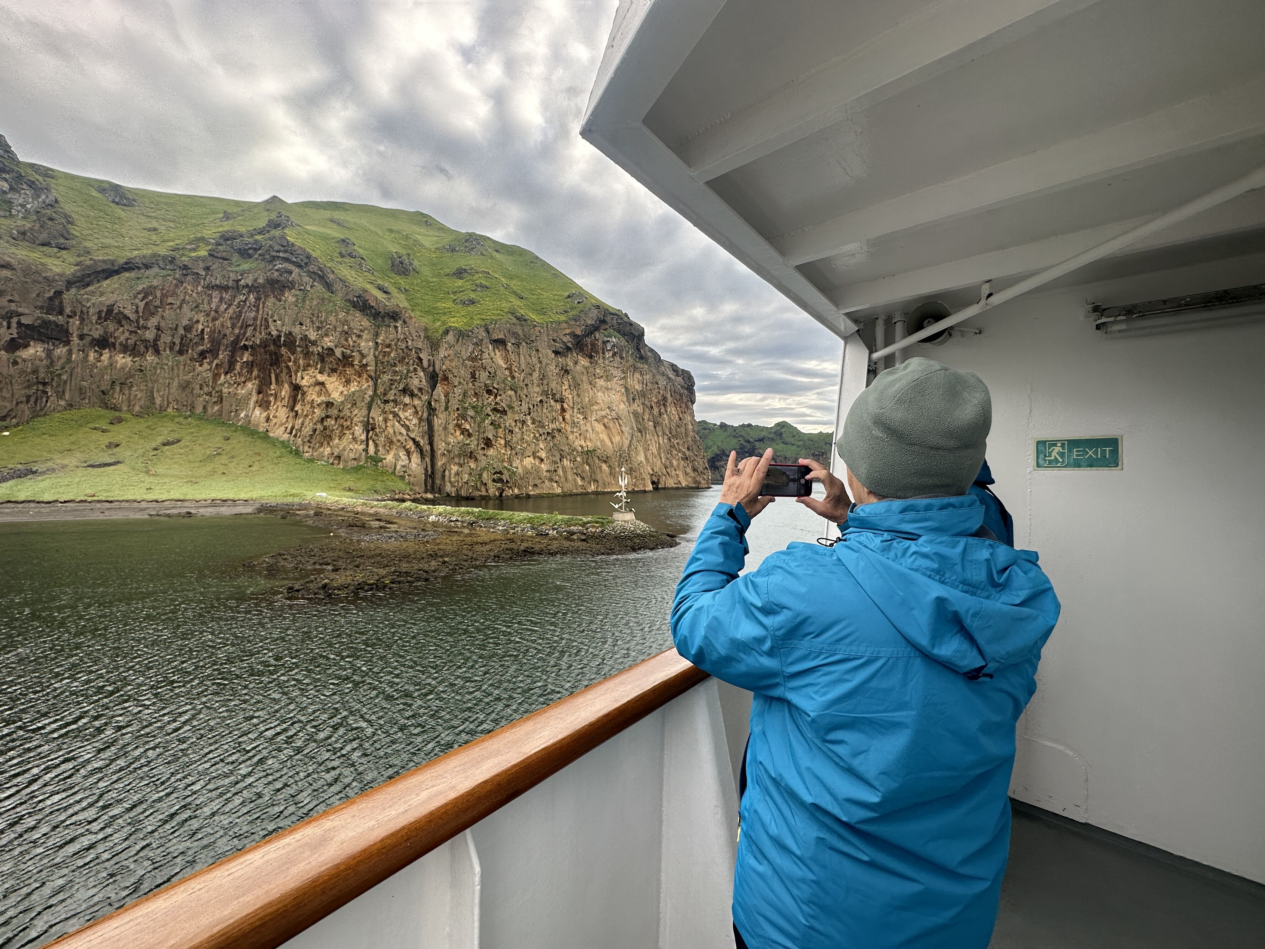 From time to time our expedition leader, Russ, made announcements inviting guests to go outside on the decks when we passed an iceberg of especially whimsical shape with arches, pillars, amphitheatres, sparkling pure white or exposing different grades of blue colours. The gallery of ice sculptures had no end.