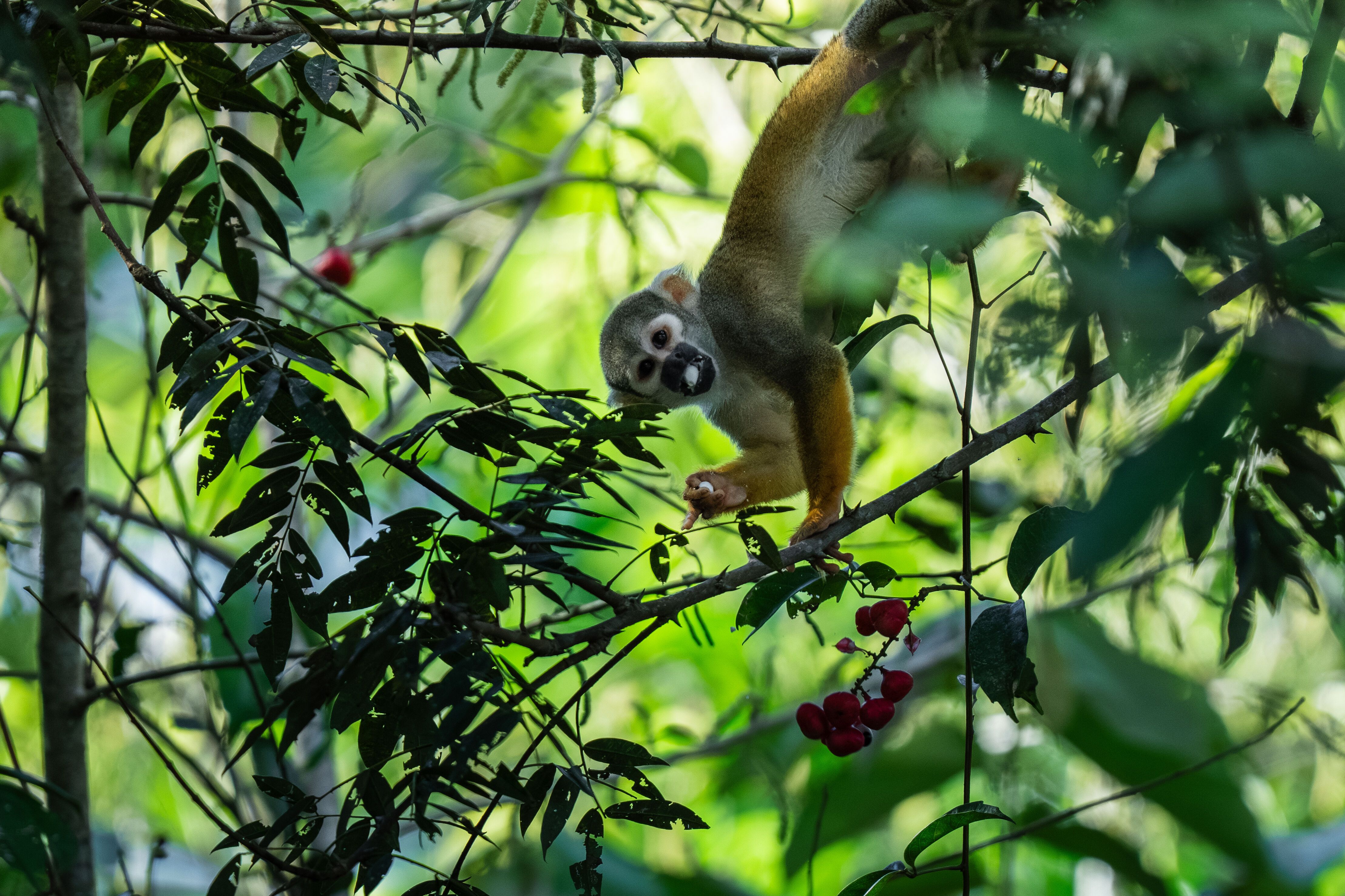 After breakfast, we had the chance to stretch our legs with our second rainforest hike. We might describe it as a casual trail, but we actually got to do a bit of bushwhacking, as our guide used a machete to clear the path of one of the lesser-used trails. It was so fun! We saw all sorts of cool critters, from the bird-eating tarantula to poison dart frogs and stick bugs. We even noticed a fancy yellow flower growing from a vine that made our guide particularly excited. The hike looped around to a giant, old-growth tree in the midst of being squeezed by a strangler fig. It was so massive and made us all feel wonderfully small. As we made our way back, we witnessed what was perhaps the highlight of the hike, a young anaconda, its belly bulging with a freshly consumed meal. It lay in the shallow waters of a creek slowly digesting its meal and posing for lots of photos.