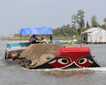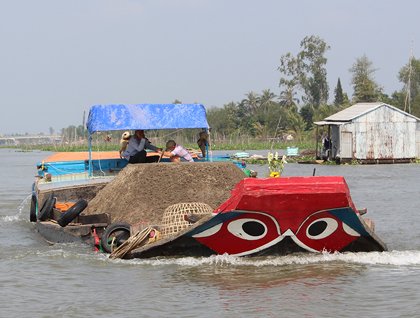 It was another early day for us. We began before dawn with fruit and pastries on the top deck before migrating into covered longboats. The boats cruised around a floating market as the sun came out of low clouds on the horizon. The market was packed with large boats selling produce, advertising their wares by hanging their product from a pole on the bow. Smaller boats pulled up alongside to purchase watermelon, pineapple, and other goods. Women paddled even smaller boats between the larger vessels, selling breakfast noodles made on the spot.