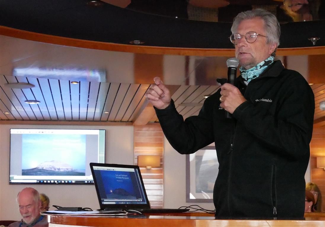 Today was yet another spectacular day in a truly spectacular landscape! Early this morning we stopped in Bartlett Cove at the entrance of Glacier Bay National Park and picked up a park ranger and Tlingit cultural interpreter. We sailed north into pea soup—fog, sky, and sea met in a haze of gray and purplish-blues. Soon we arrived at South Marble island, a well-known wildlife hotspot. This island is home to a variety of nesting seabirds, including kittiwake gulls, glaucous-winged gulls, and tufted puffins. The puffins zipped through the sky as Stellar sea lions growled at one another on the rocky shore. From South Marble we plowed into another fog bank, but emerged an hour later through misty tatters into sun. We even saw the top of the 15,325-foot Mount Fairweather between strips of cloud!