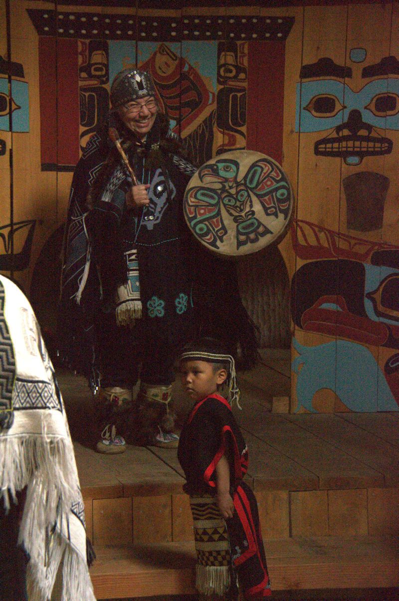 Several bears were spotted during the morning, including a mother brown bear with three large and almost adult-sized cubs that must have been over two years old. We saw a few mountain goats and continued up the bay to the very northern glaciers, Margerie and Grand Pacific. The Margerie Glacier calved a few small pieces of ice for us, and we were treated to hot sun and views of the surrounding foothills. We continued to the Lamplugh and Johns Hopkins Glaciers, which were stunning in shadowy sunlight and backdropped by snow-clad peaks. On the return to Bartlett Cove we had a very special sighting: a glacier bear. This grayish-blue morph of black bear is highly prized by natural history enthusiasts, and Glacier Bay is an excellent place to see this highly elusive animal. Following dinner, we disembarked in Bartlett Cove to stroll through forest trails and explore a whale exhibit and Tlingit tribal house.