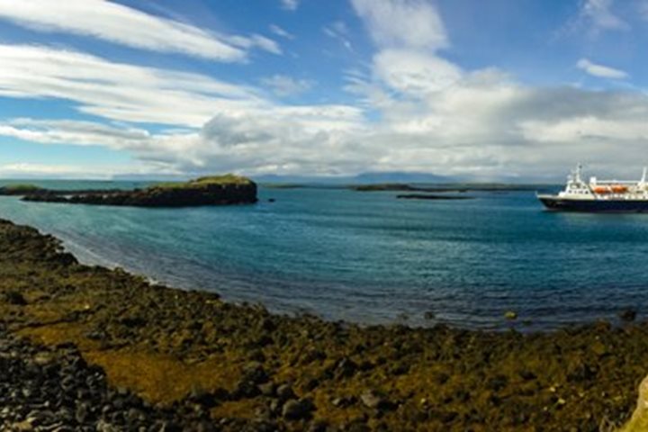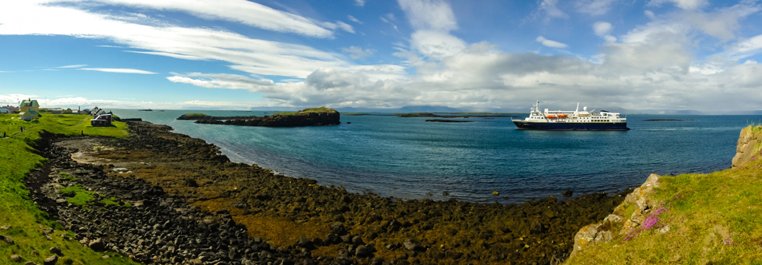 Yesterday we had our first taste of the Icelandic landscape on a tour of the hinterland from Reykjavik. We travelled north to the spectacular tear in the island’s surface at Thingvellir, site of the ancient Viking parliament, had lunch in Geysir where the steam geyser Strokkur blows its top every 3-4 minutes, then visited two breathtaking waterfalls at Gulafoss and Flaxi. We completed our circuit via the crumpled black and green volcanic wasteland of the Blue Mountains, arriving with perfect timing at the docks an hour before National Geographic Explorer cast off for our circumnavigation of Iceland. After sailing north through the night on an unruffled ocean, we woke to a grim prospect: huge black cliffs with their heads in the clouds, and rain showers blowing through from the west. But patience was rewarded: careful watching revealed an ocean full of wildlife: a minke whale across our bow, fulmars tearing at a lion’s-mane jellyfish, and everywhere shoals of small fish puckering the water up ahead. This dramatic headland is Latrabjarg, 40 miles of basalt precipice, a layer cake of lava flows which provides ideal nesting shelves for thousands of seabirds. As the Gulf Stream collides with this headland it stirs up the perfect plankton broth to feed the multitude: everywhere we looked there were guillemots, razorbills, fulmars, kittiwakes and our favorite auk, tiny sea-parrot, the puffin. As we watched, the clouds raised their hats, the rain moved east and soon the sun was sparkling on the waters, revealing the chestnut bands between each layer of black basalt in the cliffs, green daubs of vegetation on the crags and high up, the whirring clouds of seabirds, like bees swarming at a hive. The ship turned and headed deeper into the huge inlet of Breidafjordur, 30 miles wide by 70 long. Our afternoon destination was the tiny island of Flatey, a flat green pancake of land barely a mile long, but which in its day was one of the busiest trading sites in the whole of Iceland. Occupied since the first Viking adventurers settled to farm and fish, it was close to the best fishing grounds of the west coast and by the 16 th century, one of the most lucrative trading outposts of the Hanseatic League, whose commercial tentacles sought salted cod and paid good money to the hardworking fishermen of the day. It is a quiet, tranquil place now but typical of the tight-knit communities which became the backbone of a modern Norse nation. We walked, enchanted, over the lush grasslands, amid piping redshanks and drumming snipe, to the bright wooden houses of the summer community. Locals were knitting on their doorsteps or cooking for the day visitors, happy under a blue sky full of swirling marestails. As a final treat, we cruised by Zodiac past trusting puffins and tiny feeding phalaropes, under the nests of dainty kittiwakes on the basalt cliffs, and so back to the ship where the Captain’s Welcome Dinner was waiting to crown a bright, vivid day.