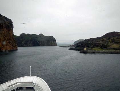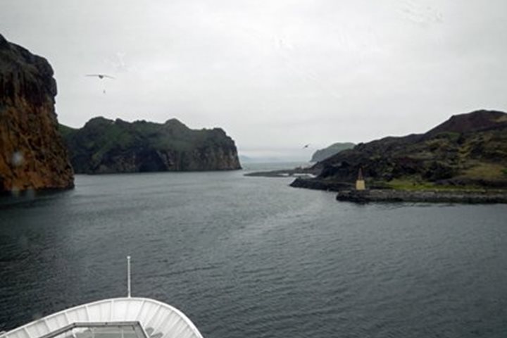 Today is our final day at sea during this circumnavigation of Iceland and we definitely saved some of the best for last. In the morning we sailed into the magnificent natural harbor of the island of Heimaey, the finest harbor in southern Iceland. Heimaey is home to about 4000 souls, most involved in the fishing industry in some way. In 1973 the peaceful life of the island was interrupted in the middle of the night on 23 January when a huge volcanic fissure running down the east side of the island opened up and began spewing hot tephra, ash, and lava onto the nearby houses. The eruption went on for months and immediately after it began the 5,200 people on the island were evacuated to the mainland. The lava added a large area to the eastern side of the island but it also threatened to close the harbor. The width of the entrance narrowed from 800 to 100 meters and the local workers with the help of the US Army Corps of Engineers sprayed seawater on the encroaching lava. Eventually the lava stopped and ironically left the harbor even better protected that it had been before the eruption. Unfortunately, however, about one third of the town was destroyed and the rebuilding took years. Today Heimaey is a very modern and prosperous Icelandic town as evidenced by their newest fishing trawler, called Heimaey, which happened to be tied up right behind National Geographic Explorer. After leaving Heimaey, we sailed southwest to visit the new island of Surtsey, which emerged in another fiery volcanic eruption in 1963. The island building event continued for four years and today the island is kept as a nature reserve and is being studied to find out how it will be colonized. Even though it was rainy by the time we arrived and visibility as reduced, it was still possible to see quite a lot of green on the hillsides, indicating that plants had already successfully colonize the lava. It was a wonderful end to a remarkable voyage around this most interesting of islands, the country of Iceland.