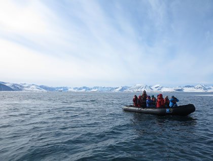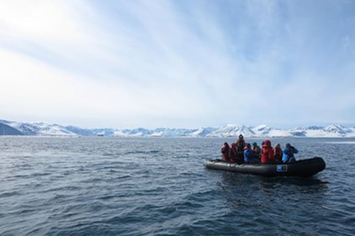 After a night cruising in the ice, we pushed forward with the ship into the heavy pack ice. Cruising in pack ice with an ice-enforced ship is an amazing experience. Since National Geographic Explorer is not an icebreaker, there is a limit to how much ice we can plow through. However, with our skilled captain, we were able to use the leads that sometimes open, and this gave us an opportunity to push forward deep into the pack ice. Today we travelled along Reinsdyrflya (Reindeer Flat), and as we travelled in leads, we discovered some walrus hauled out on the ice. Two walrus illustrated how they use their tusks to haul themselves out of the water. It is good to see that the walrus numbers are increasing since they were protected in 1952 in Svalbard, and the population now is over 2000 animals, proving this to be a healthy population. At the entrance of Woodfjord, we spotted another polar bear. It was a very skinny bear, not a “happy fat bear” as we call them when they are in good condition. The bear was walking along the shore, and it suddenly started sneaking up on some reindeer, but did not succeed in the final approach. Normally we don’t expect to see polar bears stalking reindeer, but with the lack of other prey nearby this bear chose to use energy on a hunting attempt that is normally not successful. The reindeer is faster over a longer distance, and can outrun a polar bear. With luck, it might be possible to kill a reindeer, and this has been recorded, but the polar bear is a marine mammal and lives most of the year feeding on seals on the frozen sea. As we were dropping anchor and getting ready to start our afternoon Zodiac cruise we spotted a polar bear on one of the Andøyane (Duck) islands. The bear was raiding eider nests, which is not uncommon as sea ice diminishes, forcing bears to find food in other places. Since the polar bear was on land, we chose not to stress it more, so we did Zodiac cruises around the neighboring islands. We found some walrus hauled out on sea ice, and some in the sea swimming around the Zodiacs. Together with bearded seal and birds (king eider) this was a great Zodiac cruise. This great day ended with the ship cruising out from this beautiful fjord with a spectacular view of the surrounding mountains.