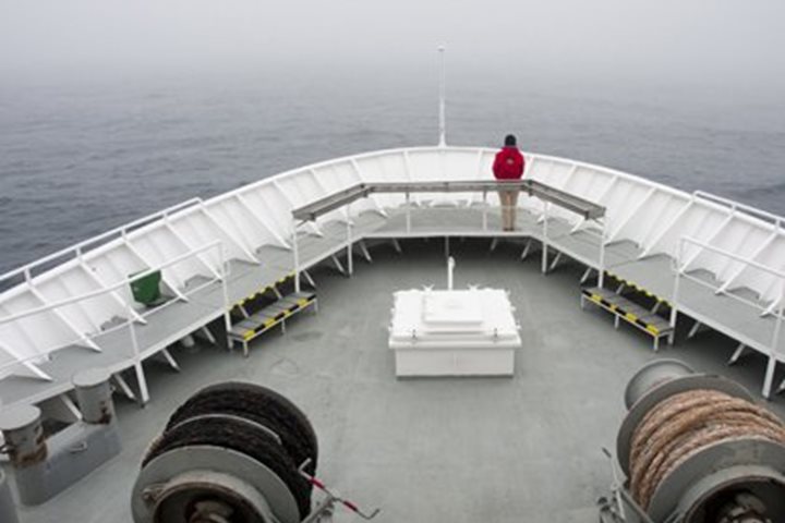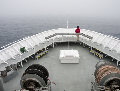Today brought another day at sea, cruising a ways off the polar ice edge. The reason we’re not spending time right near the ice is that fog has enveloped the area, and visibility is extremely poor. So for safety reasons it is prudent to give the ice some room! Hopefully, visibility will increase at some point today, and we might have a chance to look for wildlife along our path near Greenland. This particular area can be subject to fog, because the colder Arctic waters and ice collide with the warmer Gulf Stream sweeping its way north toward Europe. Anytime you have these different temperature waters meeting, it is highly likely that fog can be a possibility! We’ll just have to wait and see what the rest of the day brings. It was still nice to get outside and experience the “open ocean!” Even though there was poor visibility for most of the day, we filled our time listening to several different talks, one on public speaking, another on pinnipeds, and finally a lecture on sea level change. There was also some time for another short photo “breakout session” just before tea time. Soon it was time for our evening recap and briefing. We heard about what we hoped to do tomorrow morning, a landing on a remote Island called Jan Mayen. Wish us lots of luck, and stay tuned! Another great dinner, and it was off to bed for some sleep, and dreaming about what would come tomorrow.