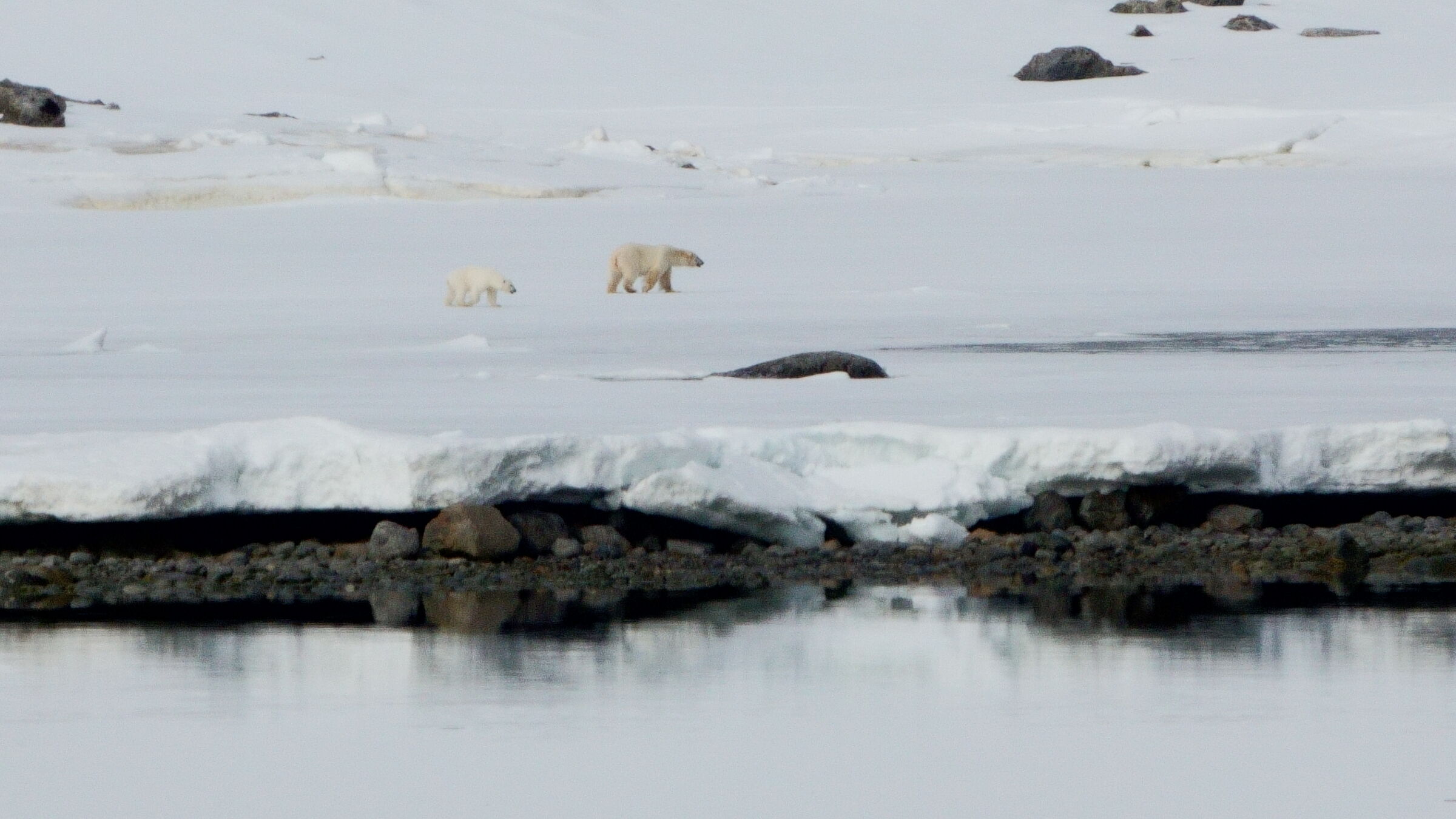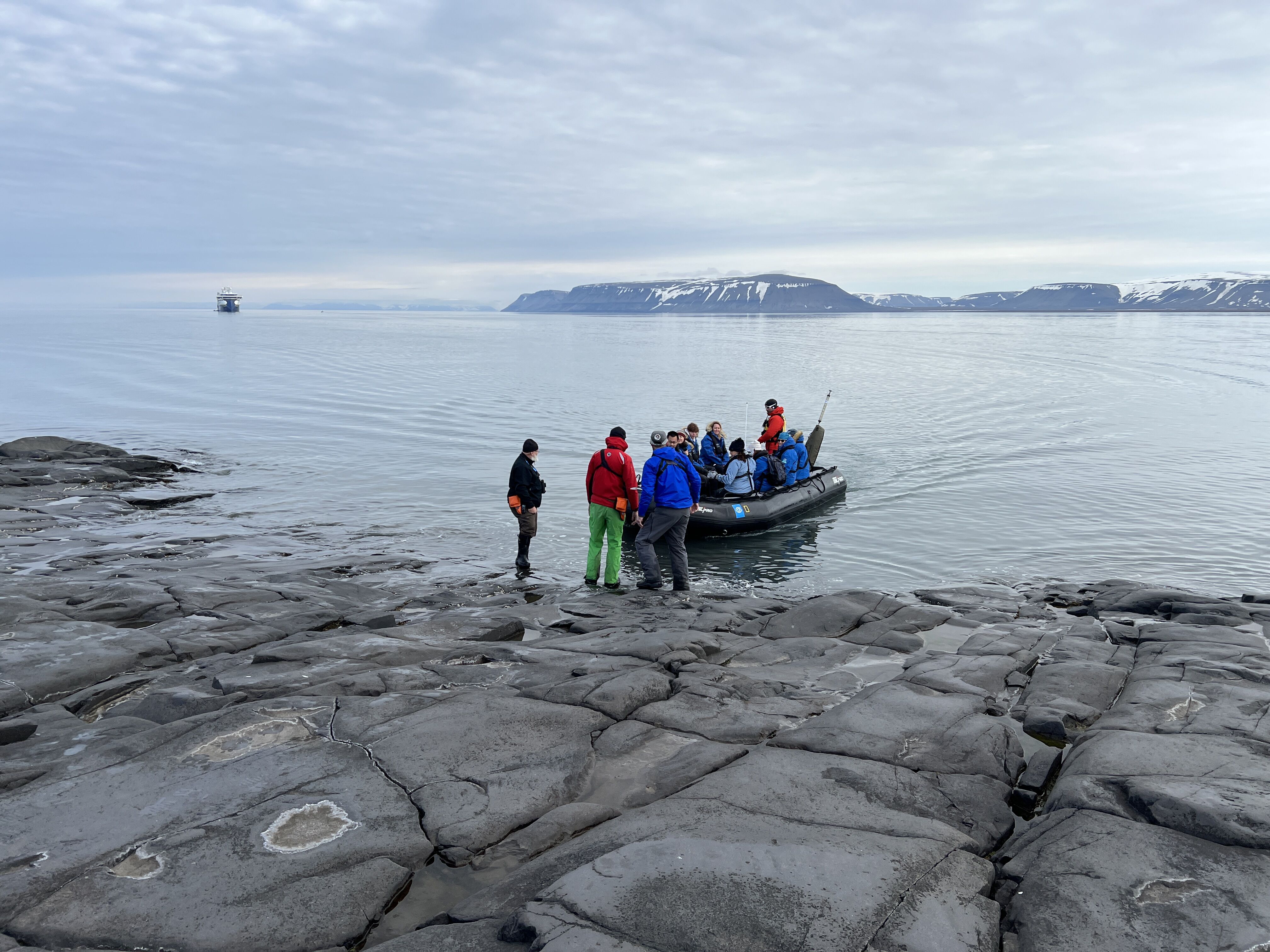 After a delicious lunch and a short positioning to the southern shore of Bellsund, we went ashore again for some more hikes during the afternoon, this time at a very interesting place called Ahlstrandhalvøya. Numerous beluga whales were slaughtered here for their meat and blubber during the 1920s and 1930s, and we observed a lot of evidence of this. Huge mounds of beluga skulls and other bones piled along the beach were particularly conspicuous. This was an interesting chapter of the archipelago’s cultural history; fortunately, it stopped a long time ago. Back on board, the bridge made an announcement over the PA system shortly before our daily recap started. It brought everyone to their feet to watch a group of belugas swimming alongside National Geographic Endurance. What a great way to finish another wonderful day exploring the High Arctic!