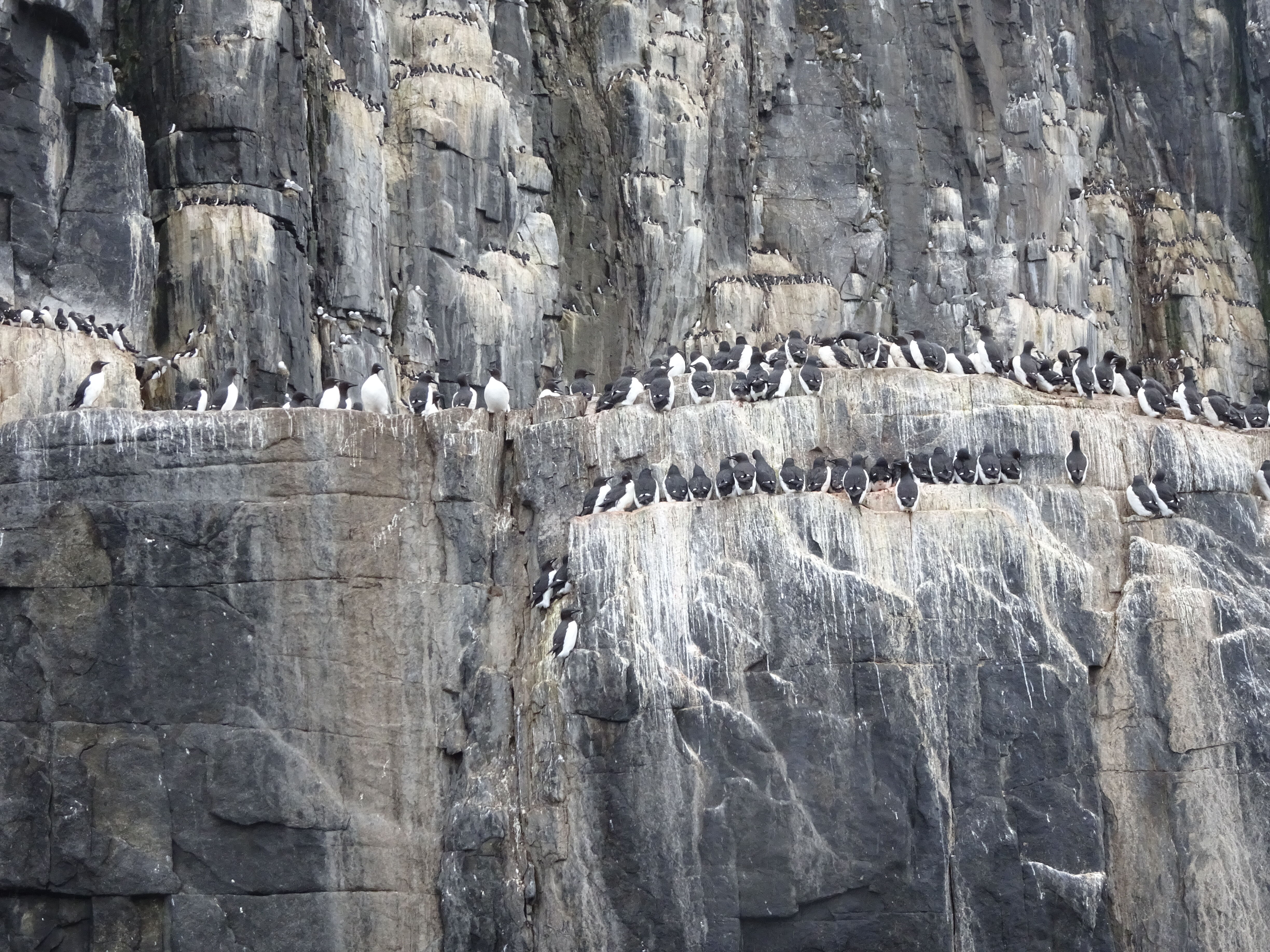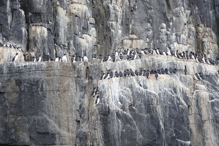 Eventually, we approached the base of the rocky slopes and had great views of the dovekie colony. Huge flocks of the tiny seabirds flew around the site, filling the air with their twittering call; their fast wingbeats and their noisy calls reminded me of the more tropical latitudes where parrots live. Dovekies, also known as little auks, are the most northerly member of the puffin family. In my opinion, they are one of the most beautiful of the auks.