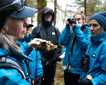 Our morning was filled with wildlife viewing from the bow of National Geographic Quest. Early on, we saw our first Pacific loons and rhinoceros auklets. A distant flurry of bird activity turned out to be five bald eagles, more Pacific loons, and many Bonaparte’s gulls all feeding together. We figured it might be a bait ball of fish. Moments later, we discovered a pod of killer whales nearby and realized the birds might have been feeding on the leftovers of a killer whale breakfast. We could not confirm, as we turned the ship to spend the rest of our time with the orcas. In the afternoon, we traveled to Alert Bay, where we disembarked the ship. We had a very special cultural experience on Cormorant Island with a welcoming ceremony by the Kwakwaka’wakw, one of the Indigenous peoples of the coast of the Pacific Northwest. We enjoyed a tour of the U’mista Cultural Centre. It was another beautiful and fun day here in British Columbia!