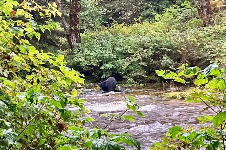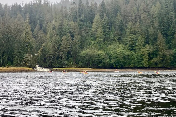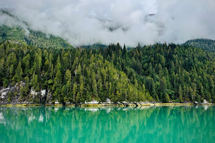 Morning found National Geographic Venture nestled in the scenic fjord of Gilttoyees Inlet. This scenic waterway is numbered with countless waterfalls that cascade down the steep walls on each side. Intermittent clouds, drops of rain, glimpses of blue sky, and the occasional sunray greeted us as we made our way, soaking, through the raw beauty of the inlet. Throughout the morning, guests were treated to a couple of programs from the naturalist team, including: “Smartphone Photography” from photo instructor Andrew Peacock and “Rainforest Ecology of the Tongass National Forest” by naturalist Lee Moll. Just before lunch, a group of humpback whales close to shore greeted us. The outside deck and bow soon filled with eager eyes as we watched countless showings of beautiful flukes. After lunch, we tucked into the ever so stunning Lowe Inlet. Two rounds of Zodiac cruises brought guests into the calm and beautiful waters in search of wildlife. Harbor seals, eagles, salmon, and the raging Varney Waterfall greeted us on our cruise through this stunning landscape.