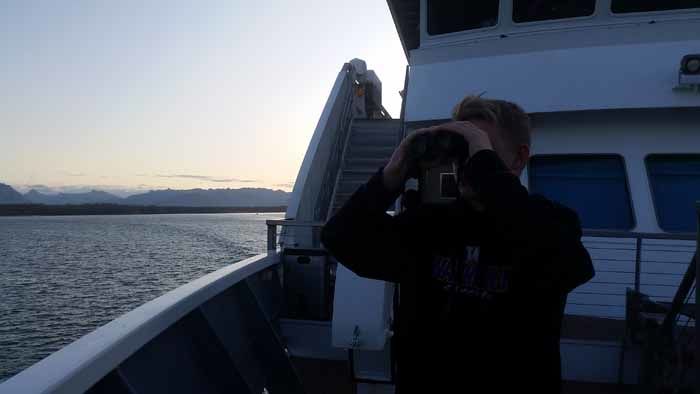 National Geographic Quest visited the low-lying limestone landscape of northwestern Kuiu Island today. Our morning at Halleck Harbor provided a mix of familiar and new. Hikers encountered several “new-to-us” forest understory plants associated with the bedrock’s regionally unique chemistry. Farther-ranging, bushwhack-style hikes glimpsed signs of beaver. Kayakers enjoyed launching from an even, soft gravel beach to share a calm bay with sea otters and abundant intertidal life. A few fortunate paddlers spotted a black bear on the beach. The afternoon brought exploration via Zodiac of the maze of long, narrow, glacially-gouged Keku Islands. Bald eagles and marbled murrelets abounded, while sea lions and black oystercatchers made occasional appearances. Moss and wildflowers provided lovely hanging garden grottos on limestone walls towering over narrow channels. Glassy waters reflected a mix of sun and passing rain showers. Rainbows and humpback whales highlighted a gorgeous evening of cruising Frederick Sound.
