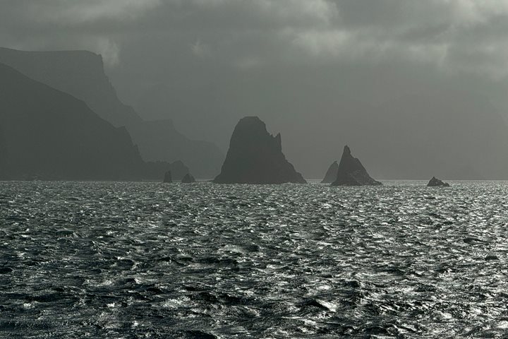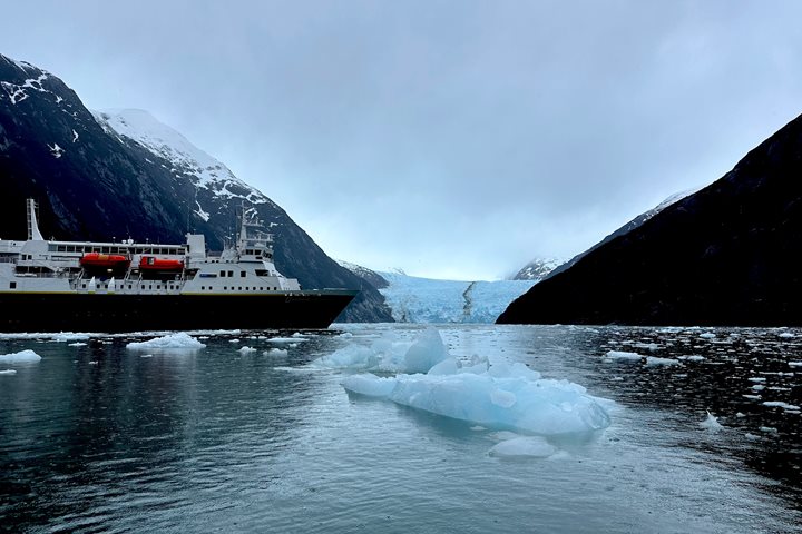 Back on board, we enjoyed lunch as we headed back to the Beagle Channel and then up to Garibaldi Fjord for our second Zodiac cruise. This fjord is deeper, narrower, and darker than Pia, and its waters are thick with drifting glacier ice. The somber skies didn’t worry us. Our on-board National Geographic photographer, Macduff Everton, had given us tips the night before for shooting when it’s overcast (crucial knowledge for Patagonia!). We had lots of opportunities on the water to play with light, color, composition, and reflection. Another unforgettable day.