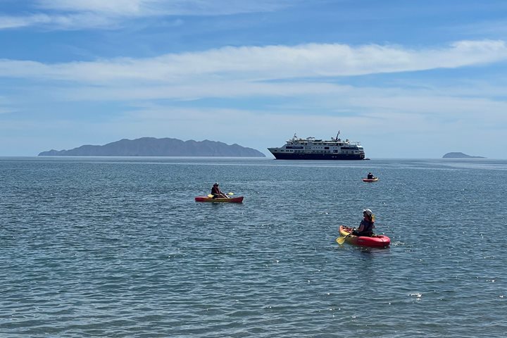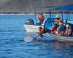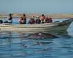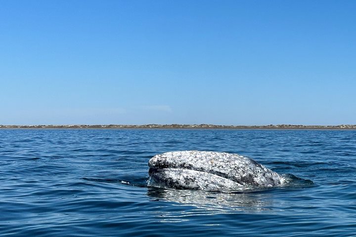 National Geographic Venture anchored in Almejas Bay, the southern portion of the Magdalena Bay complex. We enjoyed a colorful sunrise and views of the beautiful, rugged and exotic terrains of Santa Margarita. To the east, we observed the vast plains of the Santo Domingo Valley on the Baja California Peninsula. Different species of seabirds flew over the quiet waters of the bay, so guests had the opportunity to identify and photograph them. After safety briefings, all guests and staff boarded pangas for the first whale-watching outing of our voyage. Pangas are fiber-glass outboard boats that local fishermen use to fish throughout the year and for whale-watching during the winter. Once aboard the pangas, we moved down toward the southern entrance to the bay. Gray whales use this same entrance.